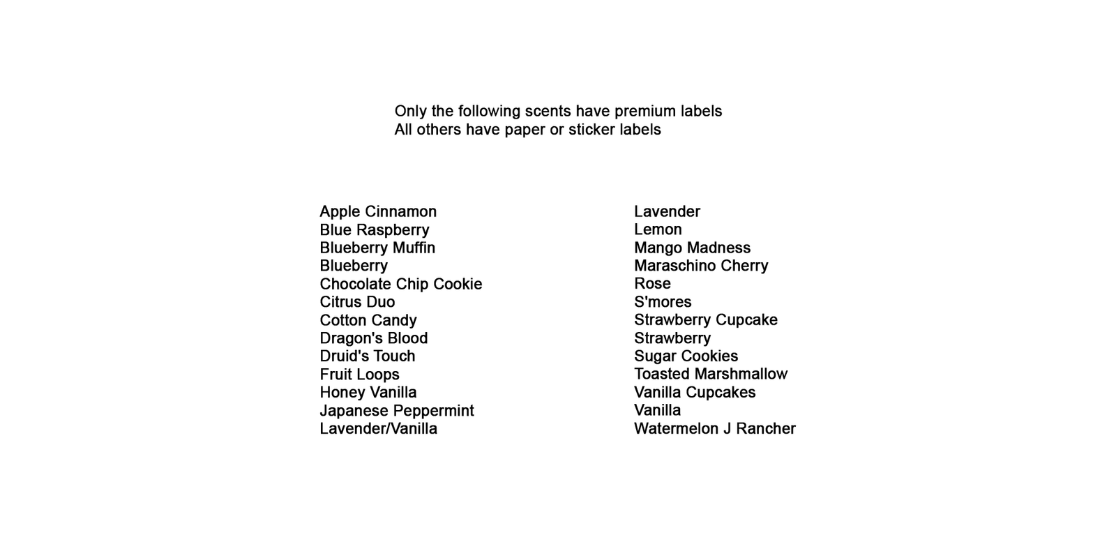| Scents 2018-2019 | Apple Cinnamon, Baby Powder, Black Cherry, Blue Raspberry, Blueberry, Blueberry Muffin, Cedarwood, Chocolate, Chocolate Chip Cookie, Cinnamon, Citrus Duo, Clove Bud, Coffee Bean, Cotton Candy, Dragon's Blood, Druid's Touch, Eucalyptus, Fruit Loops, Honey, J Ranch – Watermelon, J Rancher – Apple, J Rancher – Cherry, Lavender, Lavender Field, Lavender/Lemon, Lavender/Vanilla, Lemon, Lemongrass, Lime, Mango Madness, Maraschino Cherry, Mint (Japanese Peppermint), Mint Chocolate, Mt. Dew, Orange, Oreo Cookie, Pine (Yellow), Pumpkin Spice, Rose, Sandalwood, Strawberry, Strawberry Cupcake, Sugar Cookies, Tea Tree, Uplifting, Vanilla, Vanilla Cupcake, Wintergreen, Ylang Ylang |